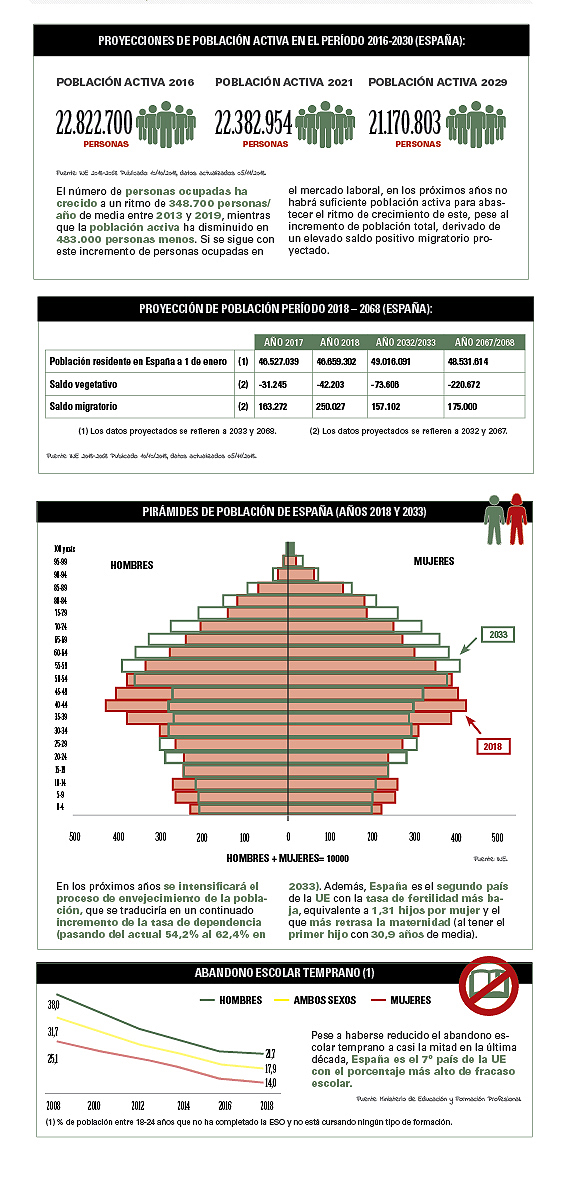 La viabilidad de nuestro sistema económico, social y laboral se sustenta en base a tres elementos: la cualificación de la población autóctona, la natalidad y la inmigración. Así, teniendo en cuenta datos como que el crecimiento vegetativo en España continuará siendo negativo en los próximos años -somos el segundo país de la UE con menos nacimientos; si bien se prevé un saldo migratorio positivo que incremente la población hasta 2033-, el progresivo envejecimiento de la población o que, con un 17,9% de abandono escolar, ocupamos el séptimo puesto en la lista del fracaso escolar de la UE, es necesario actuar con celeridad sobre estos parámetros para afrontar la caída de la población activa.