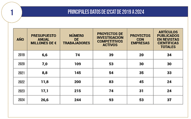 De acuerdo con las cifras actuales del centro, i2CAT tiene un equipo de 250 profesionales que, con un crecimiento del 230% desde 2020, dispone de una plantilla con 24 nacionalidades diferentes que incluyen 44 doctores, 37 doctorandos y un profesor ICREA. En términos de financiación, el centro ha sabido aprovechar las oportunidades puntuales surgidas de los fondos NextGen para lograr en 2024 un presupuesto de 26,6 M€, con 15,6 M€ de fondos competitivos y 1,6 M€ de facturación.