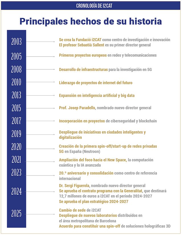 En 2023, i2CAT celebró su 20.º aniversario y, actualmente, cuenta con 250 profesionales, incluyendo investigadores de primer nivel en campos como la 6G, la inteligencia artificial, la ciberseguridad, la realidad aumentada y las comunicaciones por satélite.