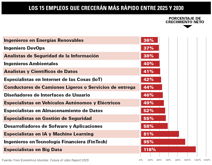 El informe del FEM también identifica un auge exponencial en empleos de Desarrollo de Software y Aplicaciones, Gestión de Seguridad, especialistas en Almacenamiento de Datos, Especialistas en Vehículos Autónomos y Eléctricos, Diseñadores de Interfaces de Usuario, y especialistas en Internet de las Coas (IoT). En el TOP15 de empleos con mayor potencial de crecimiento también se cuela una profesión convencional; es el caso de los conductores de camiones ligeros o servicios de entrega, en la que su demanda podría crecer más de un 40%. También se identifica un crecimiento cercano al 40% en la demanda de ingenieros ambientales, debido al contexto de emergencia climática.