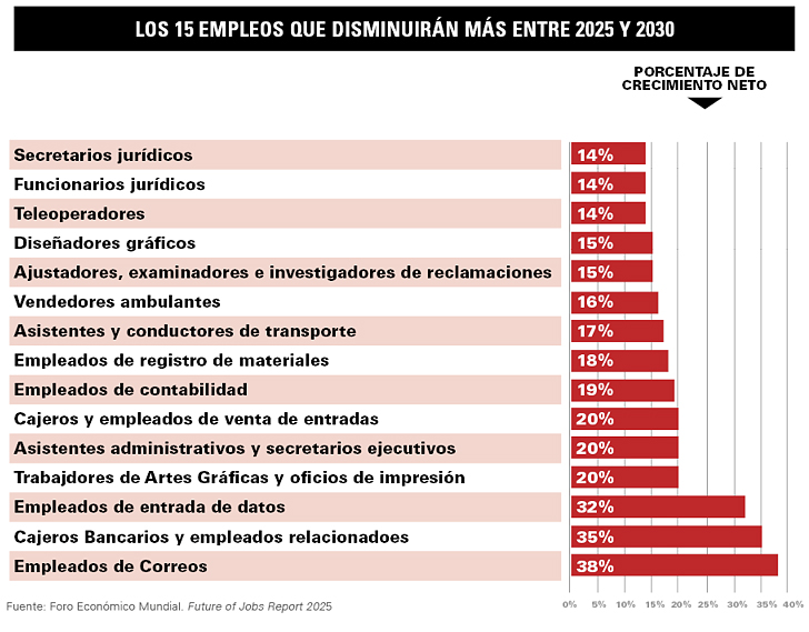 En el otro lado de la moneda, el Foro Económico Mundial identifica 15 profesiones en claro declive que podrían desaparecer o convertirse en minoritarias en los próximos años. La mayoría de estos empleos se encuentran en descenso por los cambios que ha generado la tecnología en los hábitos y forma de comunicarse de las personas, así como por la alta probabilidad de automatizar esas tareas. Entre los empleos en decrecimiento, el FEM identifica los empleados de correos como el puesto de trabajo más vulnerable, pudiendo llegar a destruir cerca del 40% de las ocupaciones actuales en los próximos cinco años.