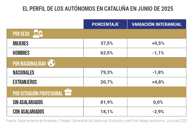 Cataluña cerró el segundo trimestre de 2025 con 574.863 personas afiliadas por cuenta propia. La cifra confirma la estabilidad del sector, pero también muestra una capacidad de crecimiento muy inferior a la del empleo por cuenta ajena. Cada vez son más los trabajadores autónomos que apuestan por la pluriactividad y por alargar su edad de jubilación.