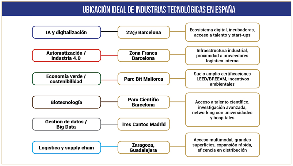— Si se trata de una empresa dedicada a la IA y a la digitalización, no tendría ninguna duda: me instalaría en 22@ Barcelona por la conectividad, la proximidad de los centros de datos, los hubs tecnológicos y el talento. En el caso de una empresa de automatización, iría a la Zona Franca, que me garantizaría el acceso inmediato a infraestructuras industriales y a proveedores. Si mi empresa estuviera relacionada con la sostenibilidad, la ubicaría en el Parque Bit de Mallorca, por el conocimiento existente allí acerca de las energías renovables y el espacio para el tratamiento de residuos y de producción limpia. Si me propusiera crear una empresa biotecnológica, pediría el ingreso inmediato en el Parc Científic de Barcelona, por la cantidad de laboratorios y la proximidad a hospitales y centros de investigación. Si me decantara por una start-up de gestión de datos, preferiría ubicarme en Tres Cantos, en Madrid, por la alta conectividad y la presencia de servidores y centros de datos. Por último, si optara por una logística, emularía a las grandes empresas de distribución: centraría mis esfuerzos en Zaragoza, por ser uno de los principales hubs logísticos de carga del sur de Europa —por ejemplo, del pescado que llega de África—, y cuyo aeropuerto tiene las tarifas más baratas.