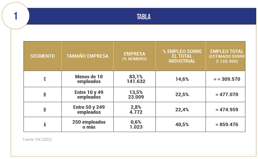 La distribución de las empresas industriales manufactureras españolas y el empleo total en cada segmento por número de empleados figura en la Tabla 1. Las políticas de apoyo mencionadas han afectado prioritariamente al segmento A de grandes empresas industriales (el 0,6% del total con el 40,5% del empleo).