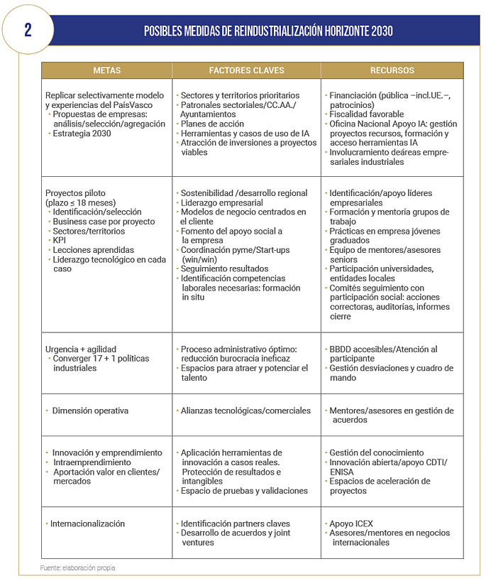 La pyme innovadora puede tener un papel protagonista, pues, aunque es más vulnerable por contar con escasos recursos, contiene valor añadido notable basado en ventajas competitivas determinantes como el talento de sus líderes, la calidad de su equipo humano, la agilidad y la resiliencia. Este colectivo, unido a las empresas de tamaño intermedio industriales (ETI), ha de representar el núcleo de las actuaciones de políticas industriales eficientes (junto a la estrategia de macroproyectos estratégicos en el segmento A). En las tablas 2 y 3 se indican posibles metas, factores claves y recursos para la Reindustrialización Horizonte 2030.