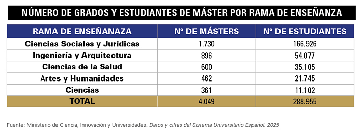 El año pasado, cerca de 289.000 personas cursaron algún título de máster en España. La cifra de estudiantes de máster se ha duplicado en la última década, sobre todo debido al auge en la oferta y la demanda de las universidades privadas del país. Del total de estudiantes de máster en 2024, más de la mitad apostaron por estudios relacionados con las ciencias sociales y jurídicas. Según los datos publicados por el Ministerio de Ciencia, Innovación y Universidades, el 57,8% de los estudiantes de máster en España eligen estudios vinculados a esta rama. La segunda más demandada fue ingeniería y arquitectura (18,7%), seguida de ciencias de la salud (12,1%), artes y humanidades (7,5%) y ciencias (3,8%).