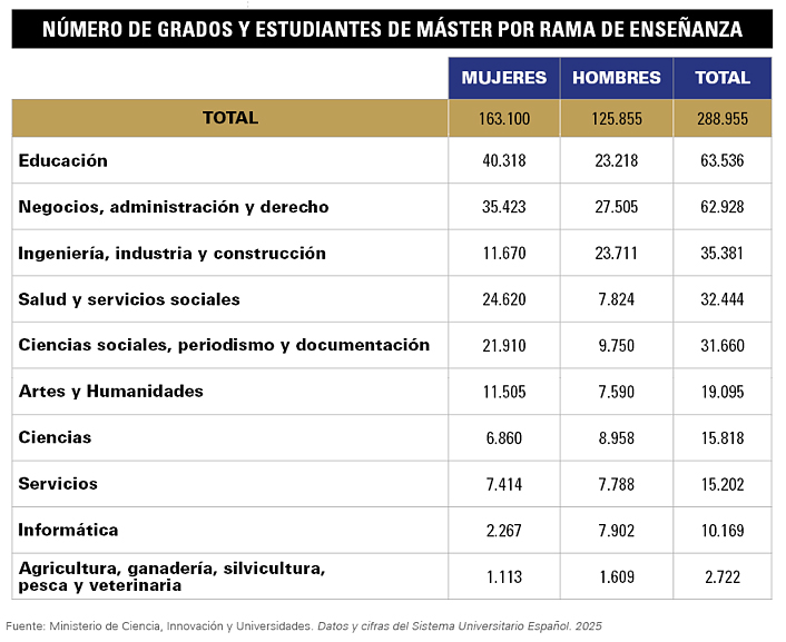 Los datos del Ministerio de Ciencia, Innovación y Universidades también muestran diferencias sustanciales según el sexo. Los másters de especialización en educación son altamente populares entre las mujeres, que prácticamente duplican en número a los hombres. Lo mismo sucede con los estudios de máster relacionados con la salud y los servicios sociales, en los que tres cuartas partes de los estudiantes son mujeres. En los másters de periodismo, documentación y ciencias sociales las mujeres son mayoría, así como en los estudios de artes y humanidades.
