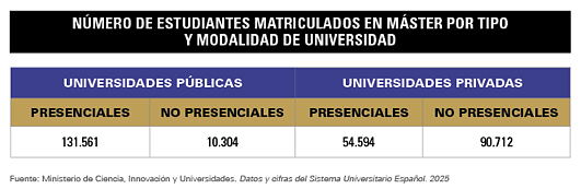 Por universidades, los datos del Ministerio muestran una clara tendencia al alza en la matriculación en estudios de máster en universidades privadas. Mientras que hace una década el número de estudiantes en universidades públicas suponía el 70% del total, en el curso pasado los estudiantes de universidades privadas superaron por primera vez a los de los centros públicos. El principal motivo se encuentra en el auge de la oferta de másters no presenciales impulsado por las universidades privadas. Si bien los alumnos de máster en modalidad presencial siguen siendo mayoría en las universidades públicas (70%), la mayor parte de los estudiantes que optan por una modalidad a distancia eligen un centro privado (90%). Por ámbitos de estudio, los centros privados destacan por ofrecer formación especializada en educación, negocios, administración y derecho. En el caso de las universidades públicas, concentran a sus estudiantes en másters de ingeniería, industria y construcción, educación y administración de empresas.