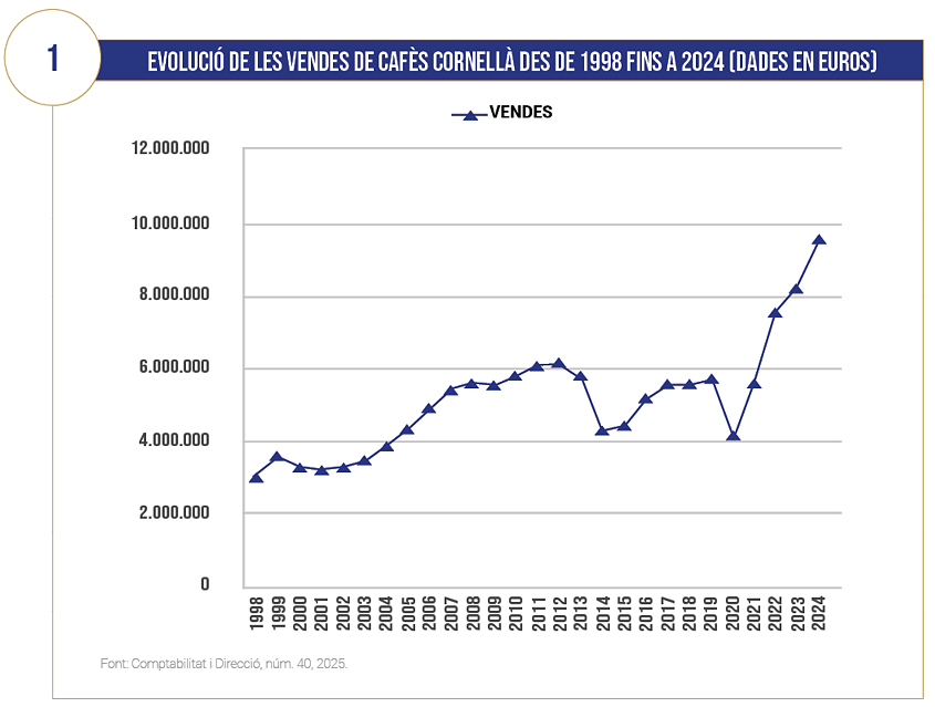 Cafès Cornellà ofereix una àmplia gamma de productes que abasten des de cafès (en gra, molts, càpsules…), cafès d’especialitat (cafès d’alta qualitat i traçabilitat amb la marca Mahogany Specialty Coffee), infusions i solucions professionals per al sector de l’hostaleria. També ofereix maquinària, formació barista i serveis de suport tècnic, i es posiciona com a referent en el sector del cafè a nivell domèstic i professional. Actualment, serveix uns 25 milions de tasses anualment. A la figura 1, s’acompanya l’evolució de les vendes, en què es comprova que en els darrers anys han tingut un creixement important. En 2024, l’empresa va generar un benefici de 81.746 euros.