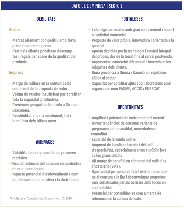 La personalització i la relació amb els clients es reforcen amb l’ús de CRM i plataformes com ANALITZA, que milloren la fidelització i permeten anticipar necessitats. Finalment, Cafès Cornellà compta amb una sòlida presència a Girona i Barcelona i disposa de capacitat per continuar expandint-se i adaptar-se a noves tendències com la venda online.
