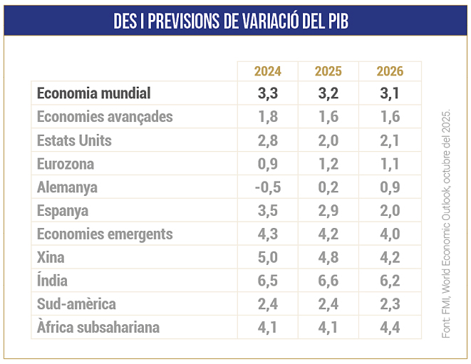 Les estimacions presentades l’octubre de 2025 pel Fons Monetari Internacional combinen el següent:  a) D’una banda, el missatge constructiu que l’economia mundial s’està adaptant als nous escenaris amb una flexibilitat raonable —la qual cosa condueix a una revisió molt lleugerament a la baixa de les projeccions de creixement per al 2025 i el 2026, com mostra la primera línia de la taula adjunta—, per ser la xifra del 3,2% per al 2025 un valor més optimista que els pronosticats pel mateix FMI en els mesos anteriors; però b) d’altra banda, les apel·lacions a la prudència continuen presents, amb qualificatius que van de “moderats” a “obscurs” (en la versió en castellà que ofereix el mateix FMI).