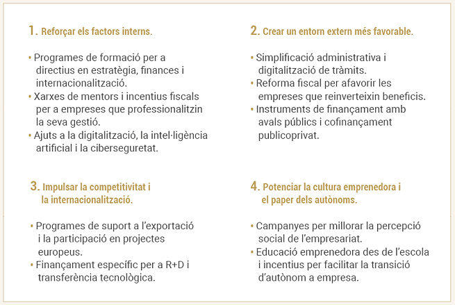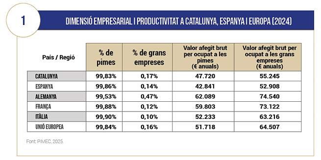 La diagnosi és clara: disposem d’un teixit empresarial dinàmic, però fragmentat. La mida mitjana de les pimes és de 3,7 ocupats per empresa, per sota de la mitjana europea (4,9). A més, la productivitat i els sous mitjans continuen per sota dels països més industrialitzats d’Europa, fet que reforça la necessitat d’un salt d’escala empresarial per competir en sectors d’alt valor afegit. El creixement i la dimensió empresarial són condicions necessàries per a una economia més productiva, sostenible i resilient.
