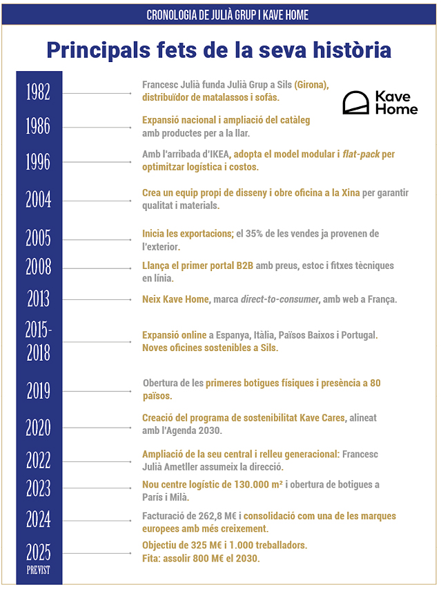 La història de Kave Home comença molt abans del seu naixement com a marca. L’any 1982, Francesc Julià, amb només 22 anys, fundava Julià Grup, un distribuïdor majorista de matalassos i sofàs a Sils (Girona). Amb una idea simple però transformadora —tenir estoc local per servir al moment, en lloc d’esperar mesos com era habitual— va aconseguir liderar el mercat de la Costa Brava, aprofitant l’expansió turística i l’auge de la demanda d’habitatges. Durant els anys noranta, amb l’arribada d’IKEA a la península, l’empresa va anticipar el canvi d’hàbits dels consumidors: va introduir el mobiliari modular i flat-pack (embalatge pla), més fàcil d’emmagatzemar i transportar, fet que reduïa costos i permetia lliuraments més ràpids. En paral·lel, va ampliar el catàleg cap al mobiliari de sala d’estar i menjador, cosa que el convertia en un proveïdor complet per al sector minorista.
