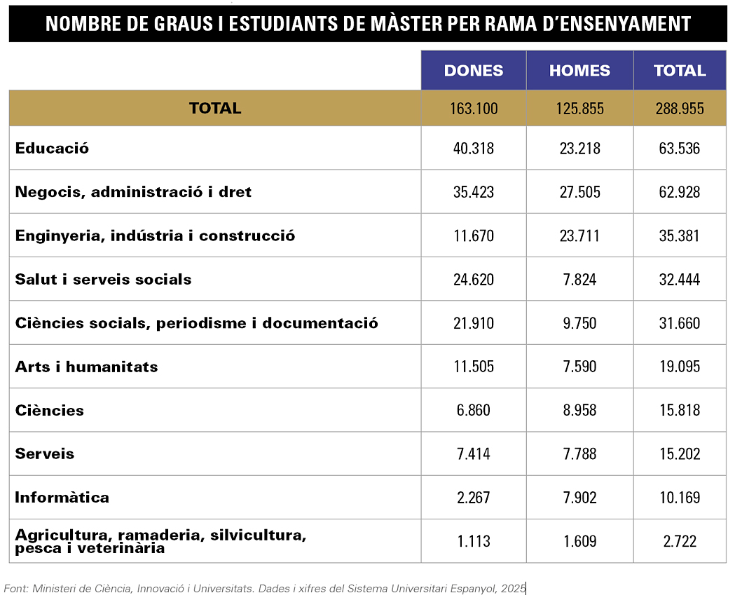 La sorpresa més gran que reflecteixen les dades del Ministeri es troba en els màsters relacionats amb l’administració d’empreses, els negocis i el dret. Tot i que l’àmbit empresarial sol associar-se més als homes, en el cas dels màsters hi ha més dones que homes que opten per especialitzar-se en l’àmbit empresarial i jurídic. En termes generals, les dones superen amb escreix els homes en nombre d’estudiants: l’any passat hi havia 163.100 dones cursant estudis de màster a Espanya, davant de només 125.855 homes.