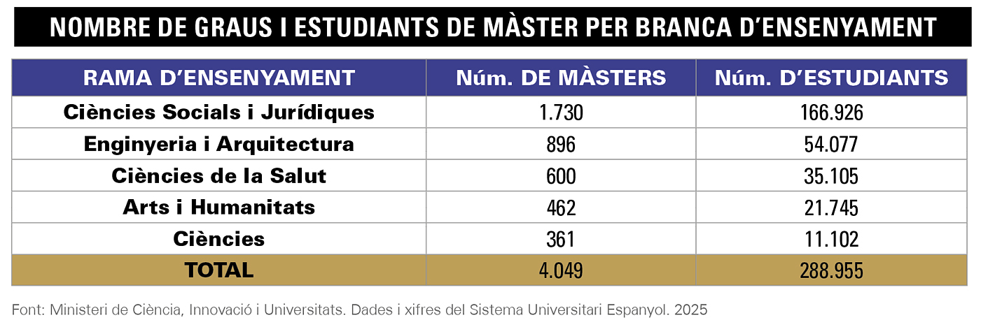 L’any passat, prop de 289.000 persones van cursar algun títol de màster a Espanya. La xifra d’estudiants de màster s’ha duplicat en l’última dècada, sobretot a causa de l’auge de l’oferta i la demanda de les universitats privades del país. Del total d’estudiants de màster el 2024, més de la meitat van apostar per estudis relacionats amb les ciències socials i jurídiques. Segons les dades publicades pel Ministeri de Ciència, Innovació i Universitats, el 57,8% dels estudiants de màster a Espanya trien estudis vinculats a aquesta branca. La segona més demandada va ser enginyeria i arquitectura (18,7%), seguida de ciències de la salut (12,1%), arts i humanitats (7,5%) i ciències (3,8%).
