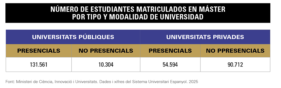 Per universitats, les dades del Ministeri mostren una clara tendència a l’alça en la matriculació en estudis de màster en universitats privades. Mentre que fa una dècada el nombre d’estudiants en universitats públiques suposava el 70% del total, en el curs passat els estudiants d’universitats privades van superar per primera vegada als dels centres públics. El principal motiu es troba en l’auge de l’oferta de màsters no presencials impulsat per les universitats privades. Si bé els alumnes de màster en modalitat presencial continuen sent majoria en les universitats públiques (70%), la major part dels estudiants que opten per una modalitat a distància trien un centre privat (90%). Per àmbits d’estudi, els centres privats destaquen per oferir formació especialitzada en educació, negocis, administració i dret. En el cas de les universitats públiques, concentren als seus estudiants en màsters d’enginyeria, indústria i construcció, educació i administració d’empreses.