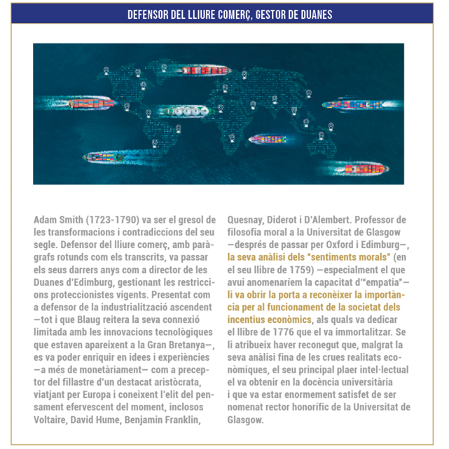 L’excel·lent text d’història del pensament econòmic que em van recomanar en l’últim curs com a estudiant de la Facultat, la Teoria econòmica en retrospectiva, de Mark Blaug, iniciava el capítol sobre les aportacions d’Adam Smith amb una sàtira atribuïda a un participant en un esdeveniment, fa cent anys, sobre el 150 aniversari de La riquesa de les nacions, en què, davant l’amplitud, erudició i varietat de temes tractats en aquest llibre, es posa en dubte que algú l’hagi llegit en la seva integritat, en lloc de conformar-se amb els destil·lats llocs comuns que se li atribueixen. El missatge a destacar seria que, malgrat les interpretacions maniquees tant en ús, la defensa per part d’Adam Smith del paper dels mercats és més matisada i rica del que es desprèn dels elogis d’uns i les crítiques d’altres. En molts àmbits Smith era un pragmàtic: reconeix el paper de l’argument de la “indústria naixent” per afavorir l’ascens d’indústries locals —tot i que també constata els riscos d’abusar-ne per encobrir ineficiències—, assumeix que la naturalesa humana és propensa a escales de represàlies també en l’àmbit de les mesures comercials, i de manera reiterada fustiga el llast dels “interessos creats” —en una versió precoç dels riscos de crony capitalism— que acaben alentint les innovacions i el dinamisme que són la base de “la riquesa de les nacions”.